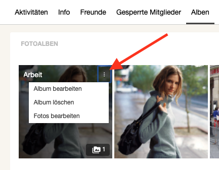 - Privatsphäre-Einstellungen können für jedes Album oder Foto von dir festgelegt werden. Möchtest du Foto-Alben bearbeiten kannst du das über das 3-Punkte-Menü in der rechten oberen Ecke (siehe Bildschirmfoto).
