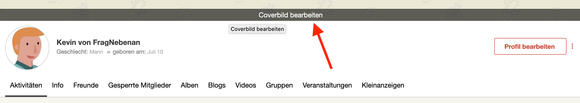 - Coverbild kann jederzeit von dir gewechselt werden, klicke dafür auf die Schaltfläche "Coverbild editieren". Die ideale Größe ist 1165 x 305 px. Ist dein hochgeladenes Bild größer, kannst du es direkt auf den sichtbaren Bereich zuschneiden. Die hochgeladenen Coverbilder werden automatisch auch in deinem Fotoalbum im Ordner "Coverbilder" abgelegt.