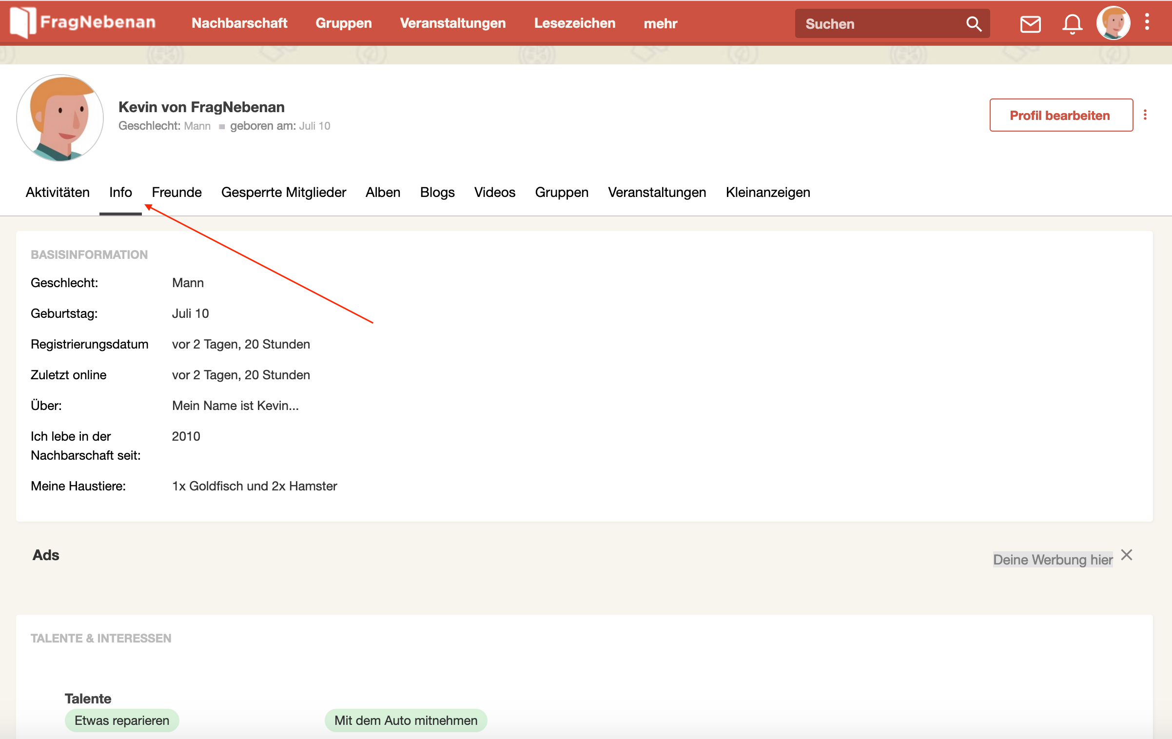 - Die Basis Informationen beinhalten dein Geschlecht, Geburtstag, Registrierungsdatum, wann du das letzte Mal online warst, dein Kurztext über dich, seit wann du in der Nachbarschaft lebst, dein Foto und deine Adresse ohne Hausnummer.