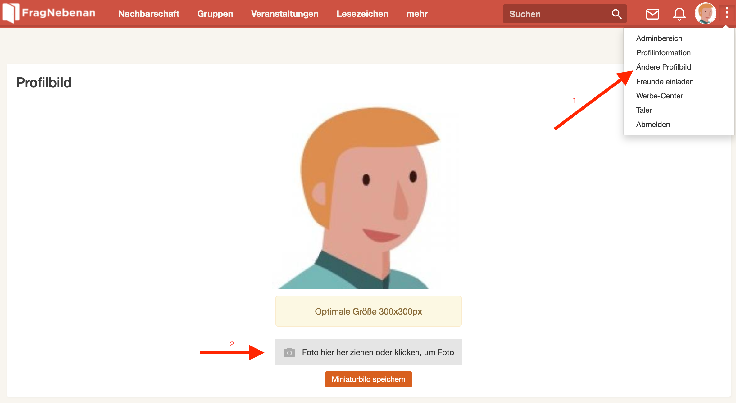 - Dein Profilfoto kann mittels Klick auf das Foto gewechselt werden. Die optimale Größe beträgt 300 x 300 px. Ist dein Foto größer kannst du es direkt hier zuschneiden. Das hochgeladene Bild wird zudem automatisch im Fotoalbum im Ordner "Profilbilder" abgelegt.