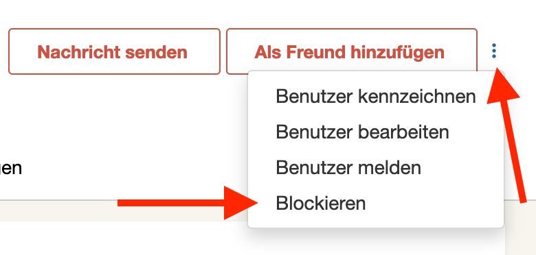 Wenn du eine Nutzerin oder einen Nutzer blockieren oder melden möchtest, klick auf dem Profil der betreffenden Person ganz rechts auf das Menü mit den 3 Punkten und wähle melden oder blockieren aus.