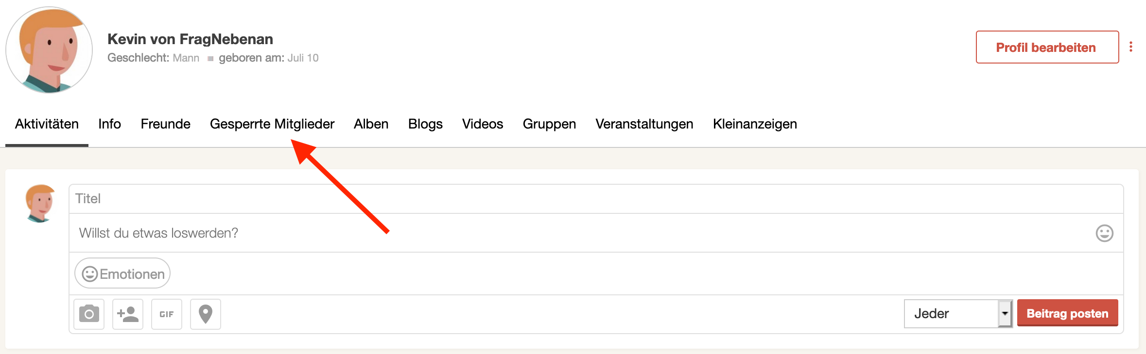 Auf deiner Profilseite siehst du in der Menüleiste neben Freunden den Punkt "Gesperrte Mitglieder", wo du alle von dir blockierten Nutzer und Nutzerinnern aufgelistet hast und die Blockierung für jeden einzeln wieder aufheben kannst.