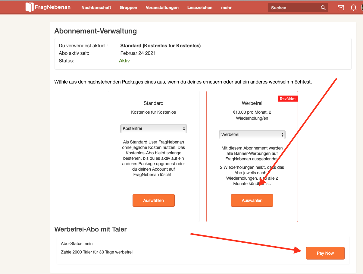Wenn du FragNebenan ohne Banner-Werbung und Featured Posts nutzen möchest, kannst du das mit einem Werbefrei-Abonnement.