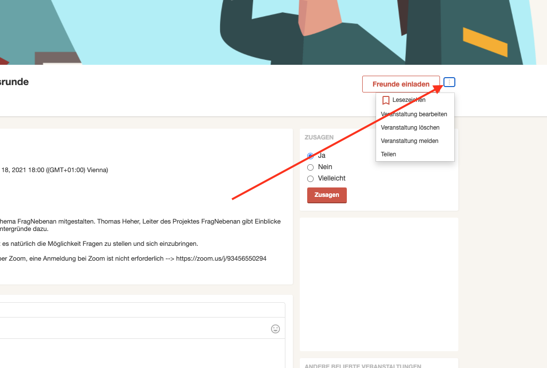 Über den Button rechts "Freunde einladen" können Freunde zur Veranstaltung eingeladen werden.