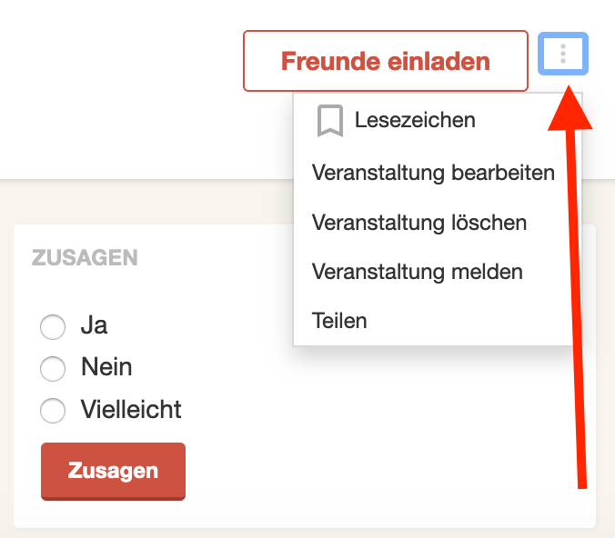 Über das Aktions-Menü direkt rechts neben dem Button "Freunde einladen" (gekennzeichnet durch 3 Punkte) kann die Veranstaltung editiert oder auch komplett gelöscht (alle Teilnehmer werden entfernt) werden.
